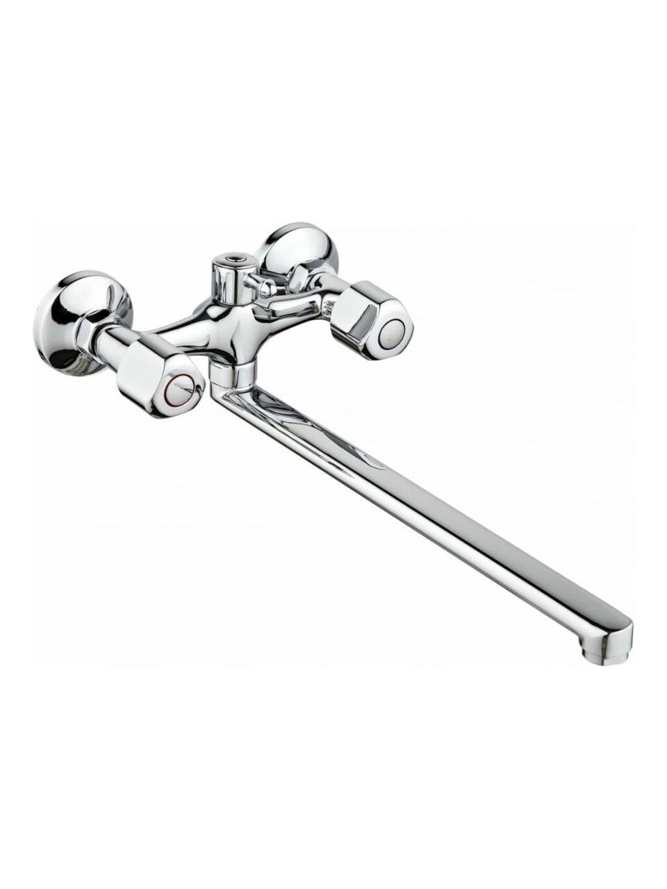 В отличие от моделей с коротким изливом или пластиковым корпусом, этот смеситель выдерживает интенсивную эксплуатацию и не требует частой замены комплектующих. Глянцевая хромированная поверхность легко очищается и сохраняет презентабельный вид даже при жесткой воде. Если вы ищете, чем отличается смеситель с керамической кран-буксой — обратите внимание на долговечность и отсутствие подтеков. Модель подходит для настенного вертикального монтажа с двумя отверстиями, а стандарт подключения 1/2" облегчает замену старого оборудования.