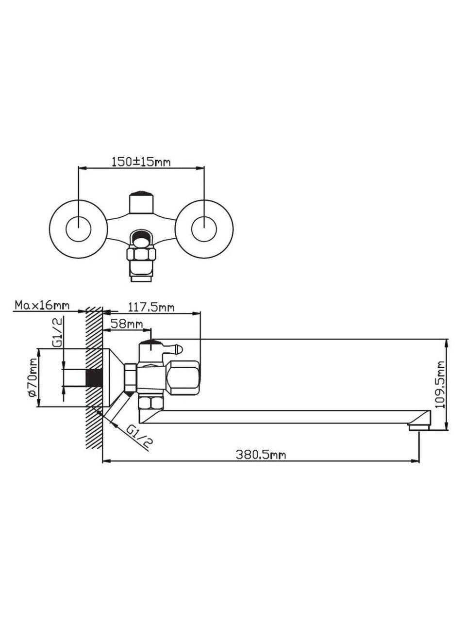 Длина излива составляет 32,2 см, что обеспечивает удобство при наполнении ванны и использовании душа. Межосевое расстояние — 150 мм, стандарт подключения — 1/2".