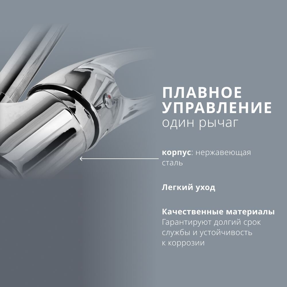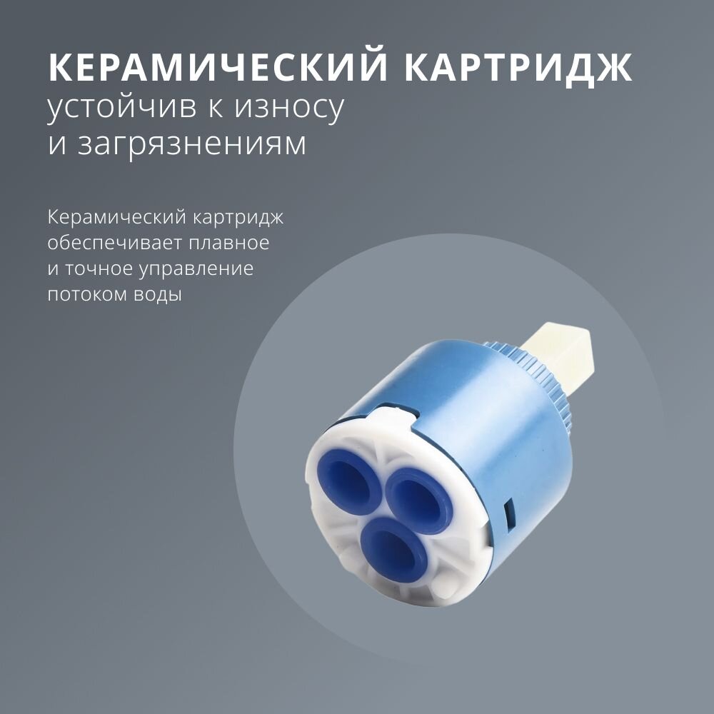 - Корпус из цинкового сплава, глянцевая хромированная поверхность, керамический картридж — долгий срок службы без протечек