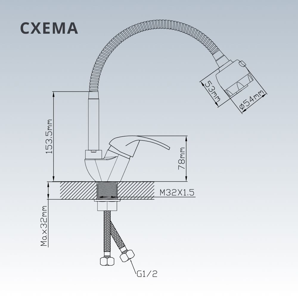 Для установки требуется одно отверстие диаметром 45 мм. Монтаж горизонтальный, крепление на гайку, стандарт подводки — 1/2".