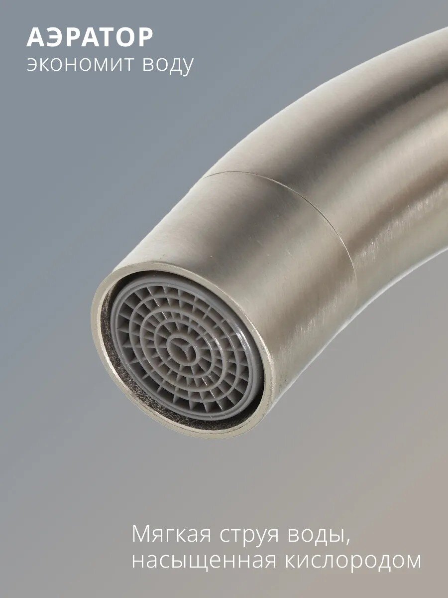 Высота излива — 16,7 см, длина — 11,9 см. Излив средний, высокий, поворотный, что удобно для повседневного использования.