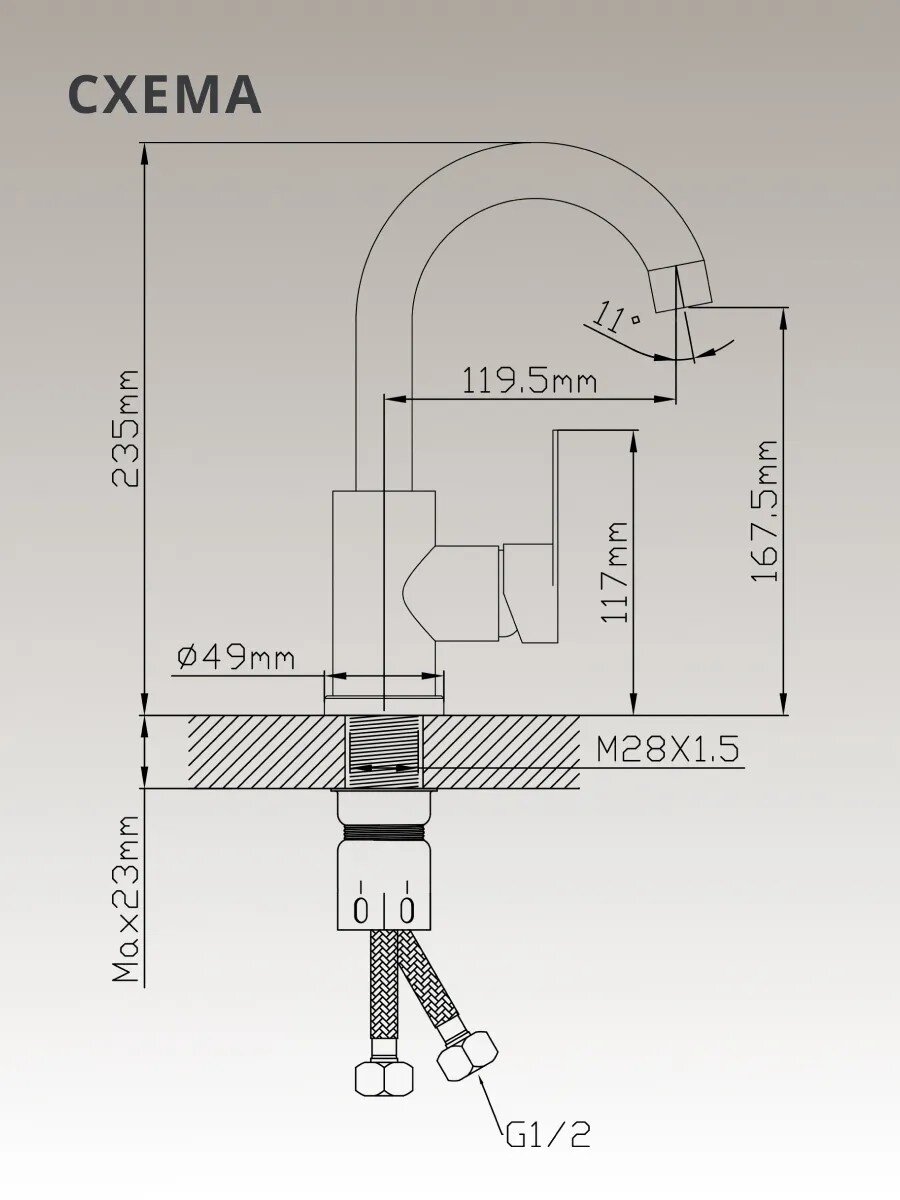 Для установки Aqwin A10310S-2 требуется одно отверстие диаметром 35 мм. Стандарт подключения гибкой подводки — 1/2 дюйма.