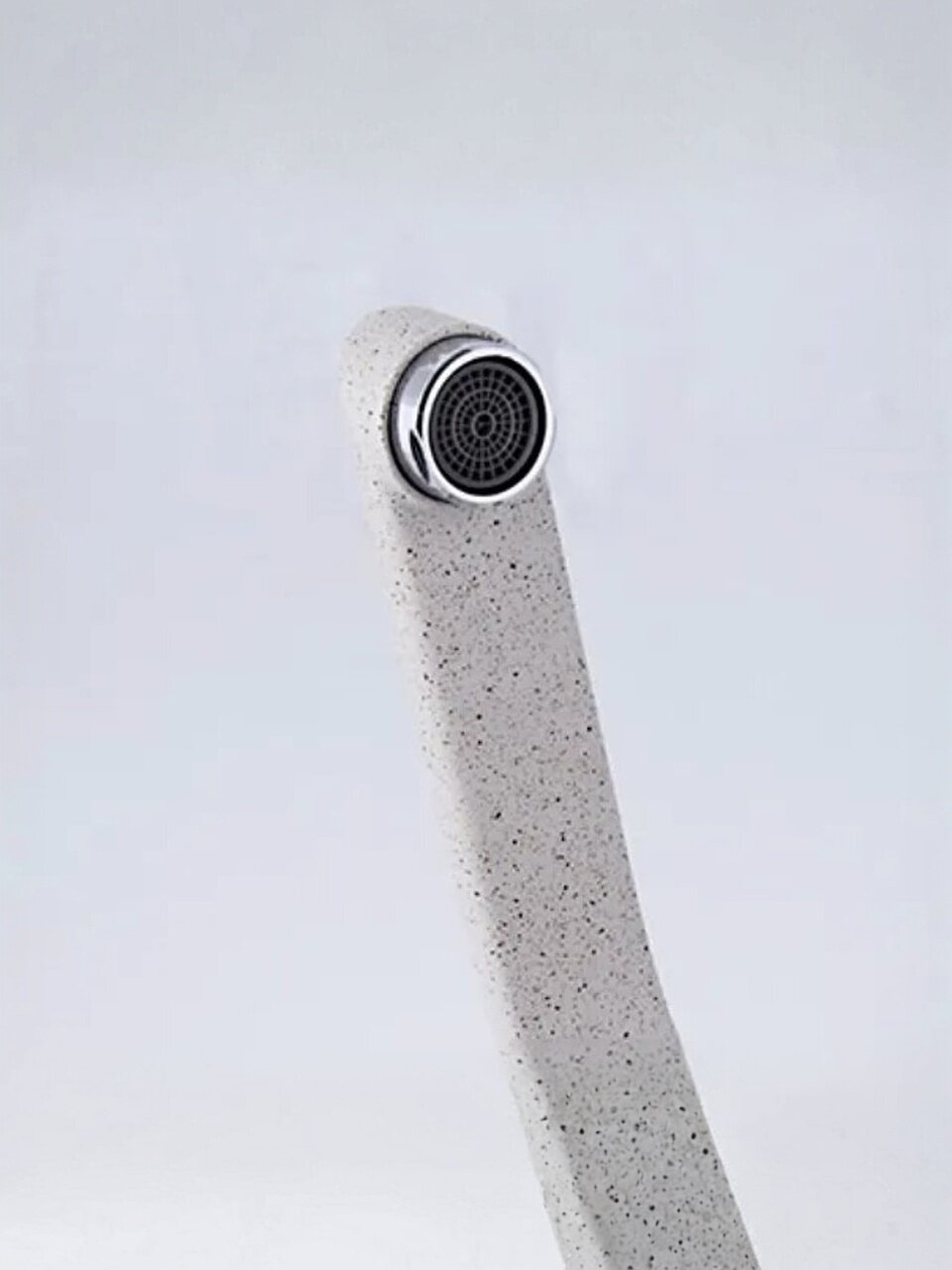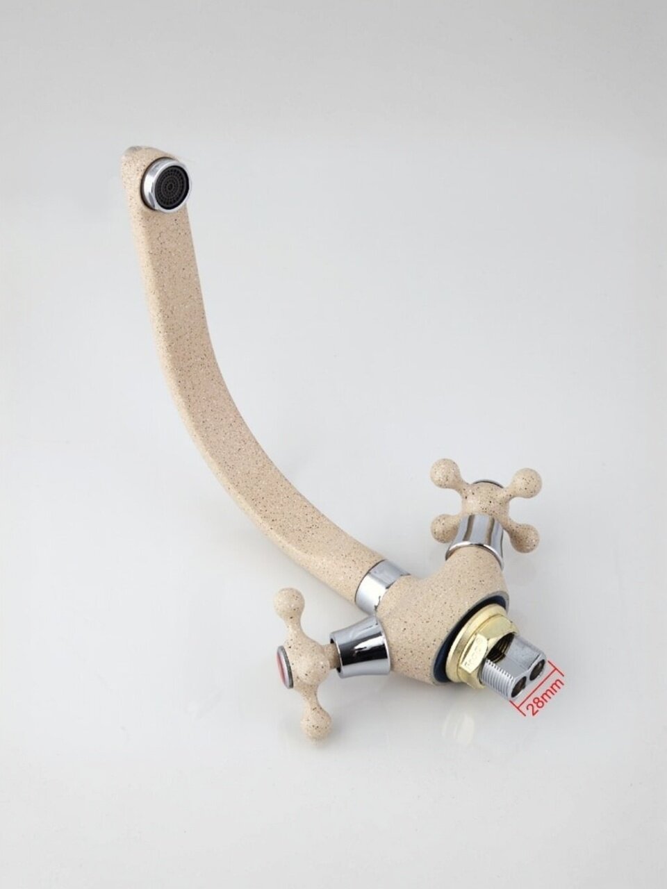 - Современный светло-бежевый смеситель с высоким изливом — удобно мыть крупную посуду и наполнять высокие ёмкости