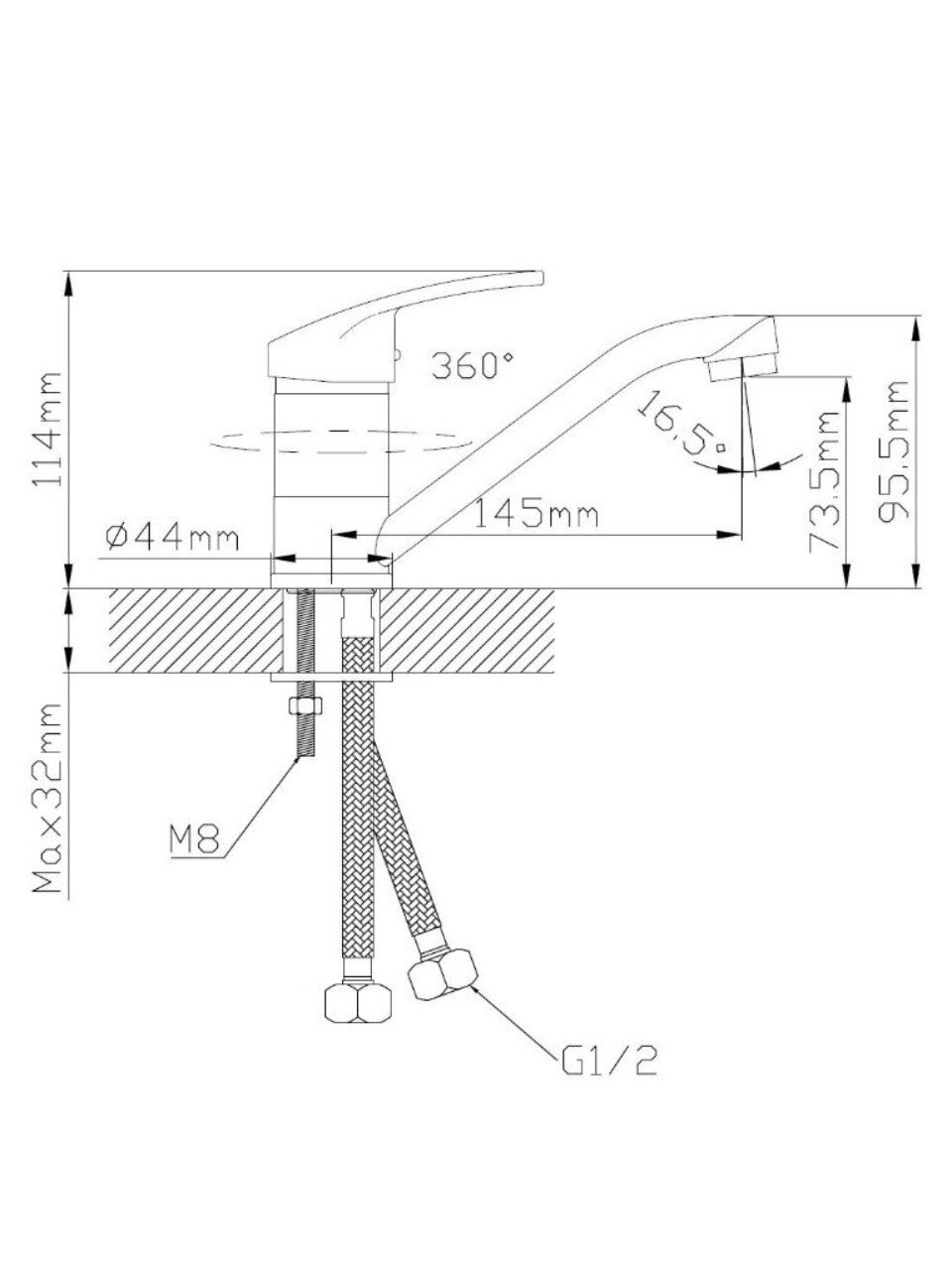 Для установки требуется одно монтажное отверстие диаметром 35 мм. В комплекте — гибкая подводка длиной 35 см (2 шт.), стандарт подключения — 1/2".