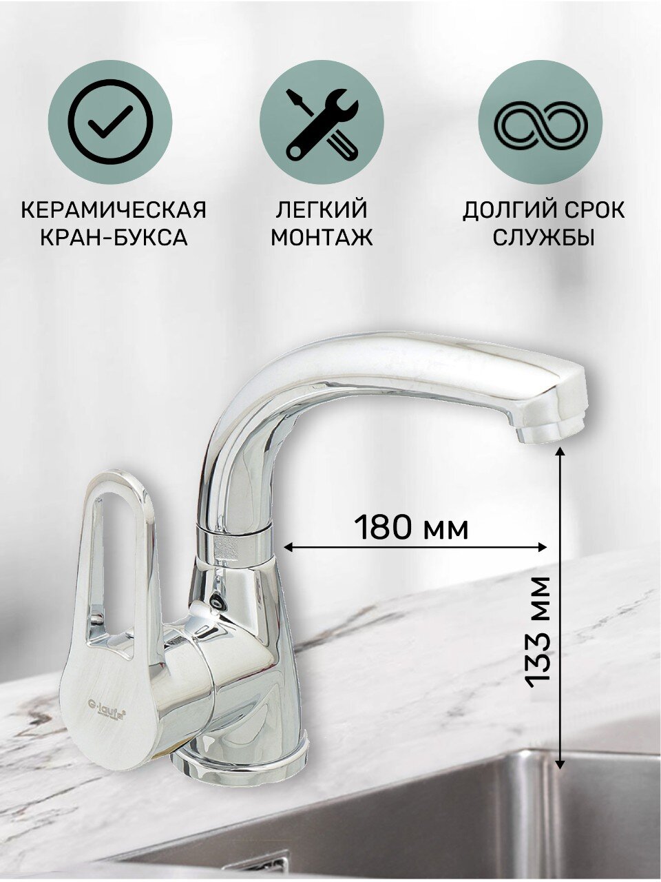 Корпус смесителя изготовлен из силумина с глянцевым хромированным покрытием. Управление — однорычажное, с поворотным изливом и керамическим картриджем для долговечной службы.