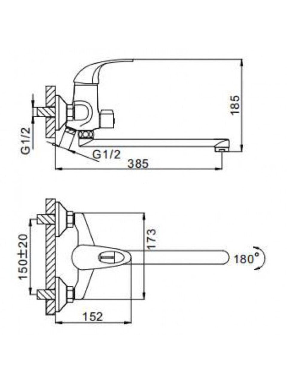 Смеситель рассчитан на вертикальный настенный монтаж с межосевым расстоянием 150 мм и двумя отверстиями. Длина излива — 35 см, стандарт подводки шланга — 1/2 дюйма.