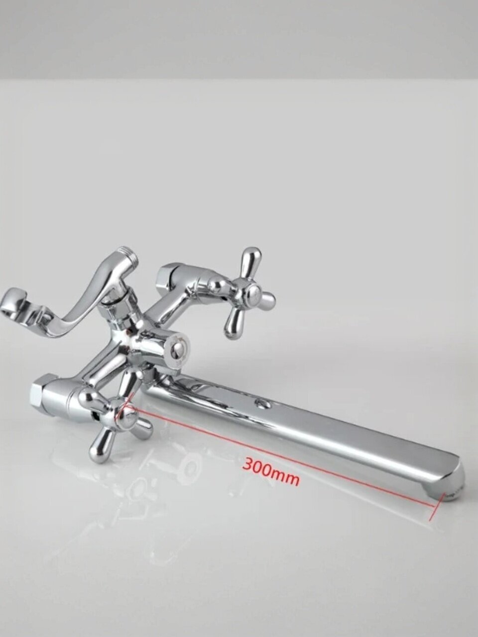 Излив смесителя длинный — 30 см, поворотный, без функции короткого излива, с глянцевой поверхностью и аэратором. Это удобно для наполнения ванны и использования душа.