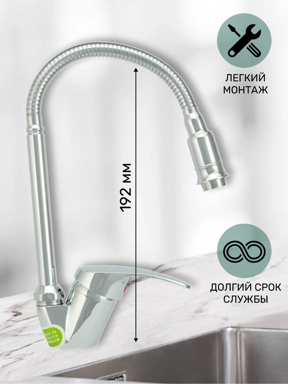 - Гибкий излив 19,2 см — удобно мыть большие кастрюли, набирать воду в высокие ёмкости, направлять струю под нужным углом