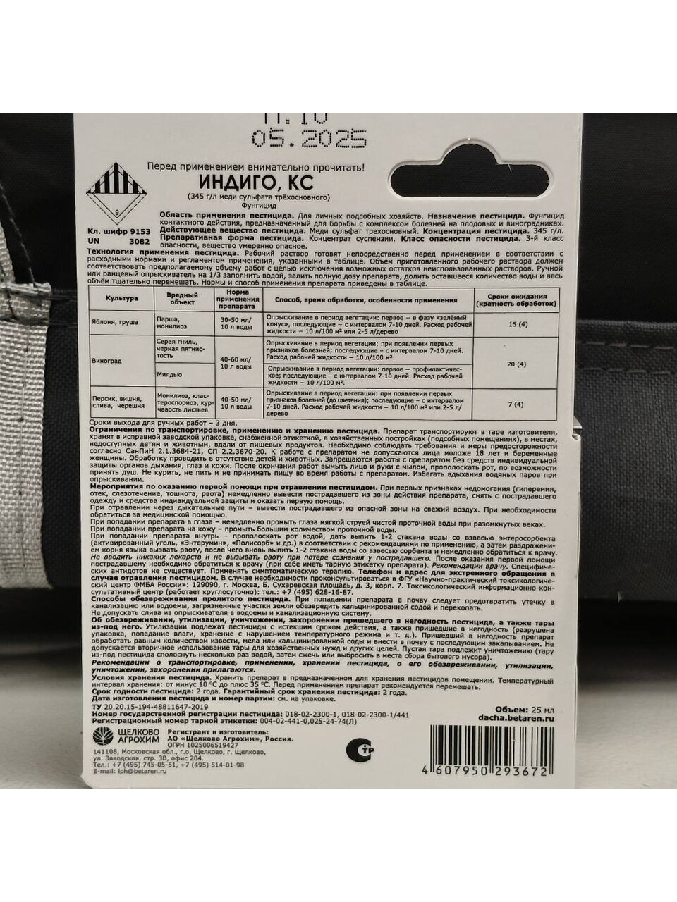 Фунгицид Индиго - препарат на основе меди. Его ионы уничтожают колонии и споры грибов. Состав активно защищает садовые культуры от опасных заболеваний. Эффективен при температуре от 0°С до 35°С, а также в дождливую погоду. Эффект сохраняется в течение 7-10 дней. Безвреден для культур.