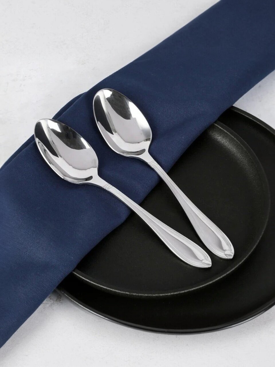 В комплекте 2 столовые ложки из нержавеющей стали без покрытия, с металлическими ручками. Цвет — серебристый, стиль — современный.