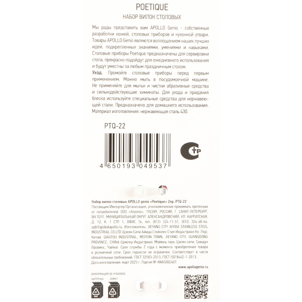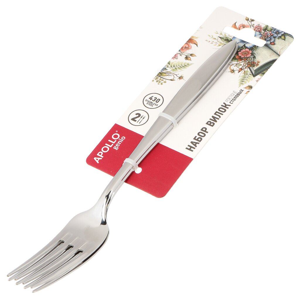 Вилка столовая Apollo Genio Poetique PTQ-22 — нержавеющая сталь, 2 предмета, современный дизайн для сервировки дома и дачи. Легко мыть, долговечна, подходит для подарка.