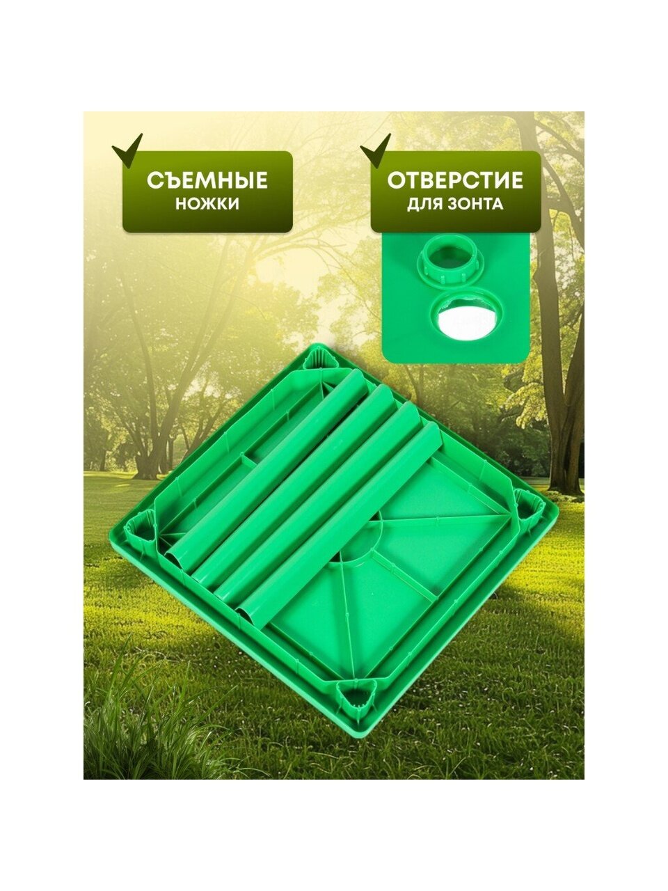 Если требуется компактный стол, чтобы создать уютную атмосферу застолья, легкий и практичный пластиковый столик — отличное решение. Он широко используется в качестве мебели на дачах, в кафе, на базах отдыха или на спортивных объектах. Ножки разборные, что облегчает транспортировку и складирование. В центре столешницы имеется отверстие, закрытое заглушкой, для установки зонта.