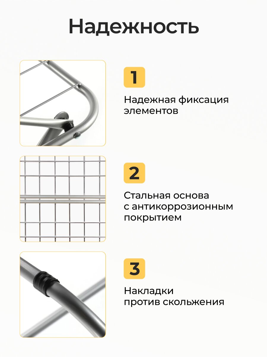 Максимальная нагрузка — до 15 кг, благодаря прочной окрашенной стали и усиленным прутьям. Можно сушить крупные вещи и несколько стирок одновременно.