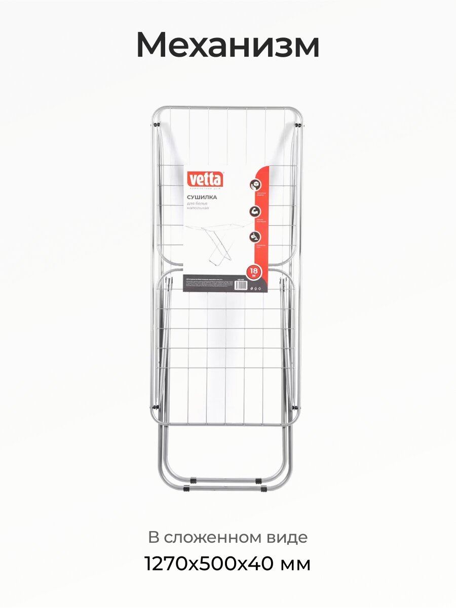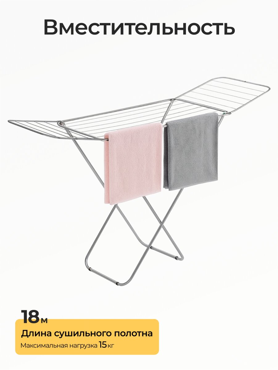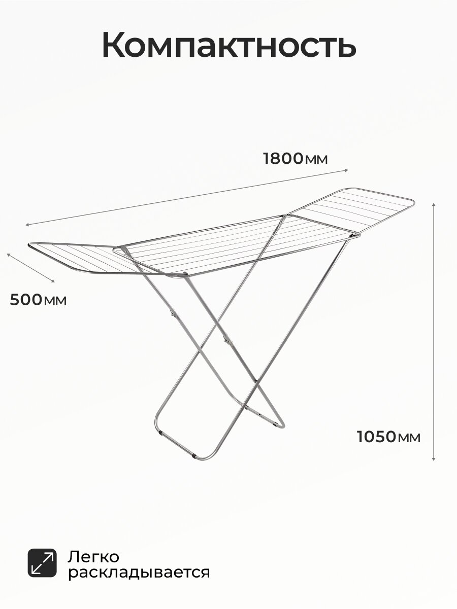 Габариты в разложенном виде — 180х50х105 см, рабочая длина для белья — 18 метров, 7 прутьев обеспечивают равномерную сушку.