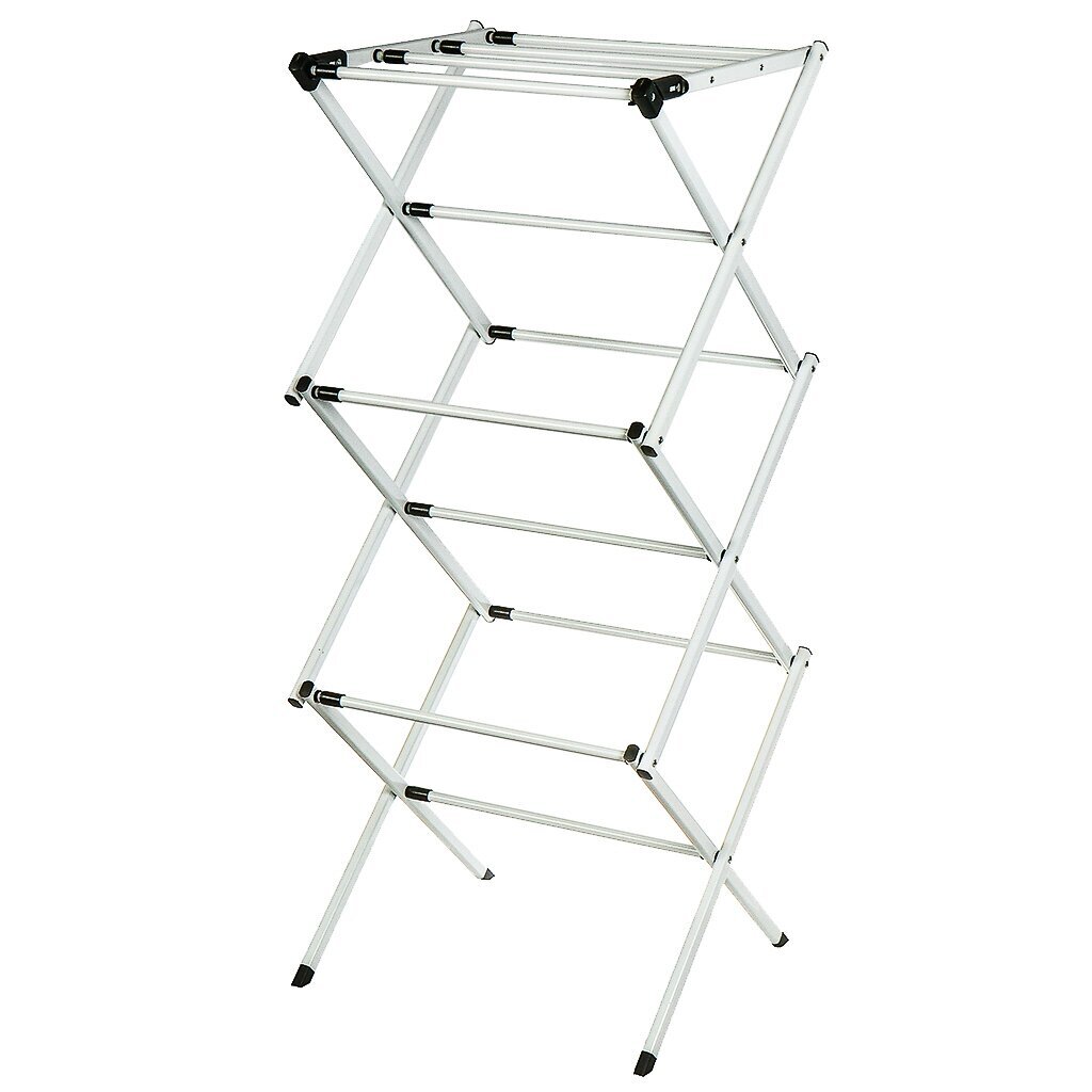 Сушилка раскладывается в высоту и закрепляется с помощью пластиковых креплений у верхней полки конструкции. Чтобы сложить ее нужно разъединить пластиковые крепления у верхней полки и сложить ее сверху вниз.