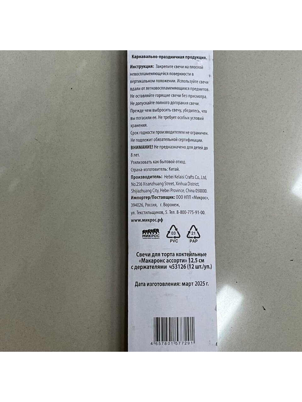 Свечи для торта, 12.5 см, Макаронс, коктейльные, ассорти, с держателями,Ч53126