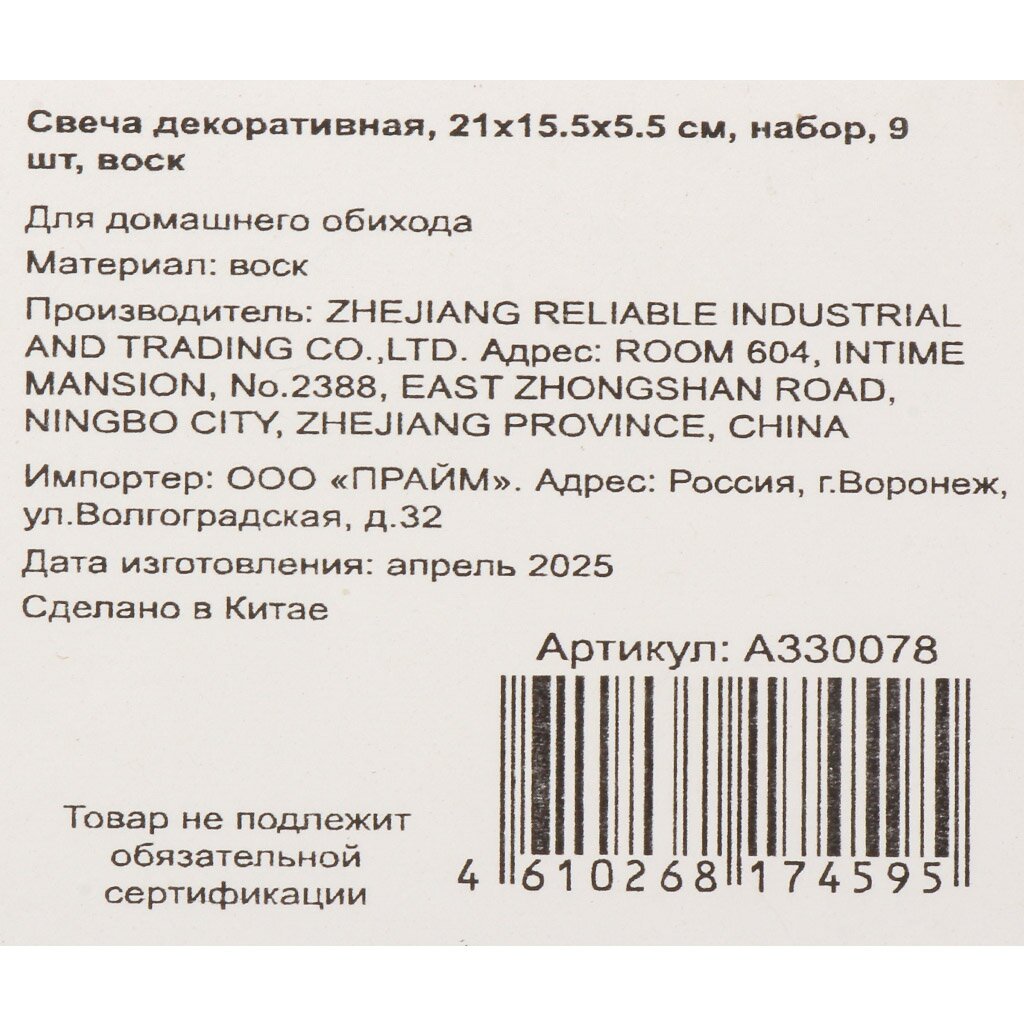 Свеча декоративная, 21х15.5х5.5 см, набор, 9 шт, воск, A330078