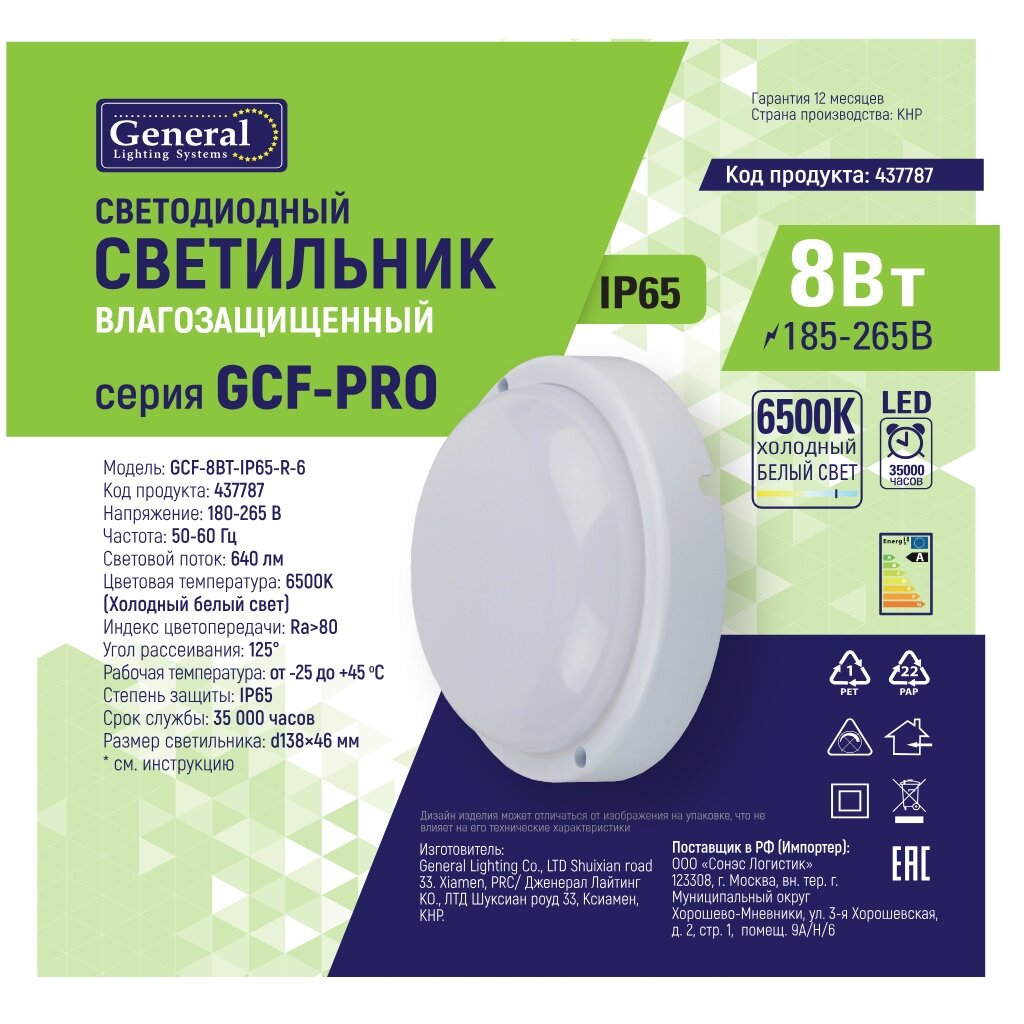 Светодиодный светильник ЖКХ GE 8 Вт IP65 — надёжное решение для освещения подъездов, производственных помещений и дачи: влагозащита, холодный свет, срок службы 35 000 ч.
