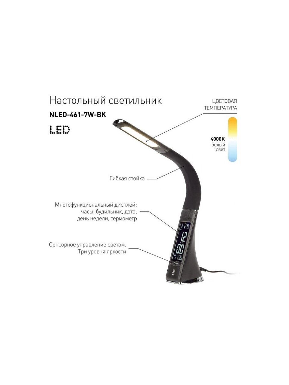 Настольный светильник ЭРА NLED-461-7W-BK со светодиодами (LED) в качестве источников света в дизайне "под кожу". Оснащен сенсорным управлением, есть регулировки яркости освещения - 3 уровня. Главное преимущество светильника - ЖК дисплей с функциями часов, будильника, календаря и термометра. Сенсорная кнопка с обратной стороны стойки обеспечивает опцию выбора яркости дисплея с возможностью его выключения. Высота плафона регулируется гибкой стойкой, направление света регулируется поворотом плафона в любом направлении.