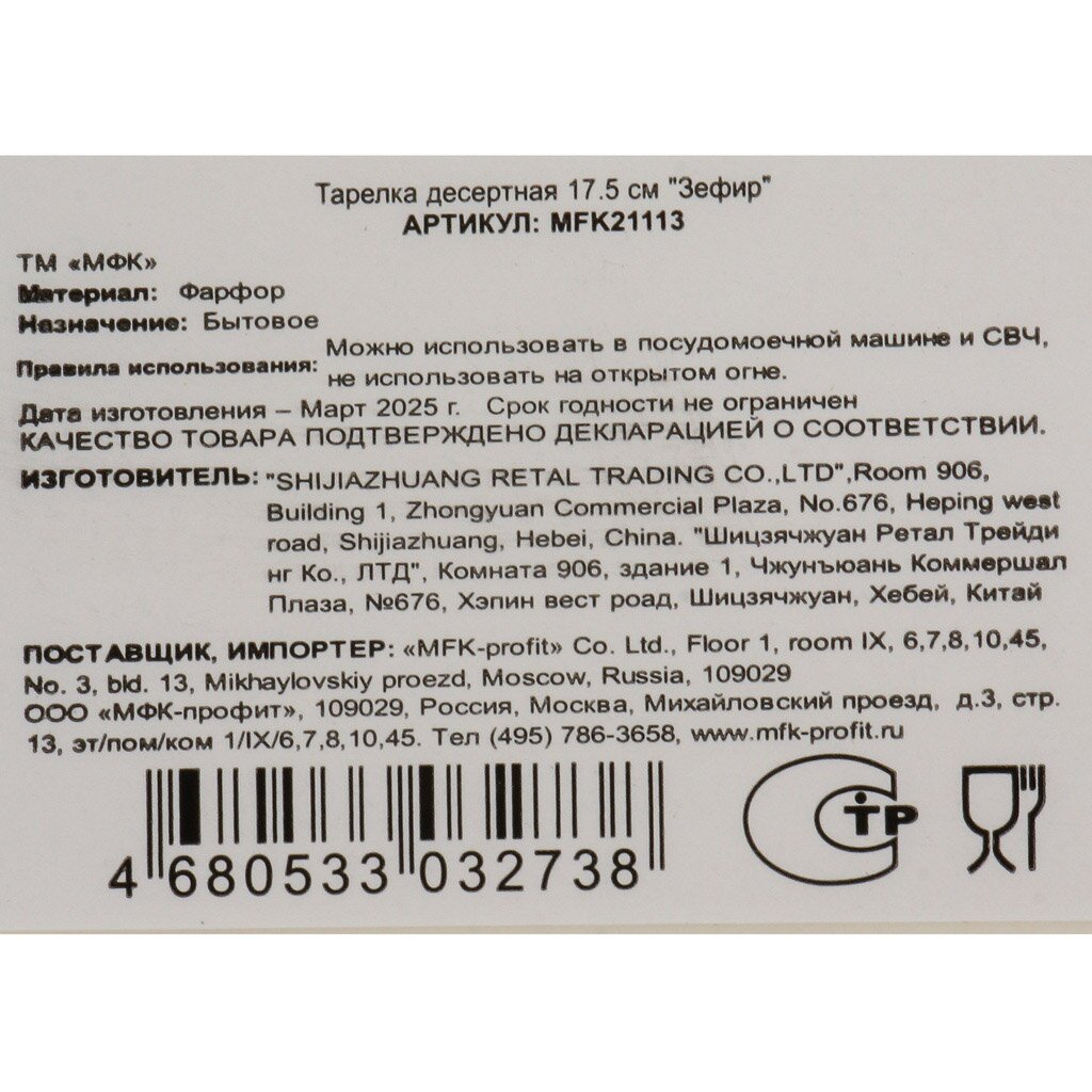 Вы можете приобрести «Тарелка десертная, фарфор, 17.5 см, круглая, Зефир, МФК, MFK21113» и другие товары в нашем интернет-магазине в Смоленске по низким ценам и с бесплатным самовывозом.