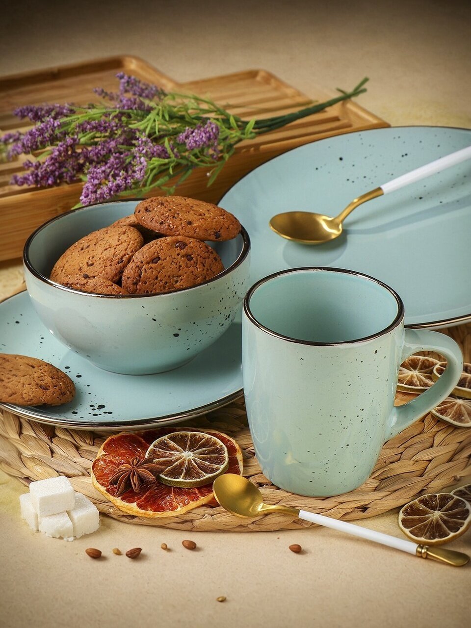 - Уникальный дизайн: голубая керамика с крапинкой оживит любую сервировку, создавая атмосферу уюта и современности