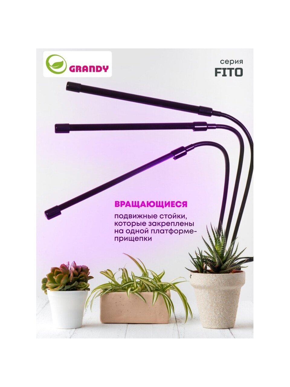 Светильник для растений состоит из 3 отдельных фитоламп, каждая из которых рассчитана на 3-5 небольших растений. Мощность лампы 10 Вт. Регулируемые подвижные ножки, на которых закреплены светодиоды, позволяют направлять потоки света в нужные стороны так, как вам это необходимо.