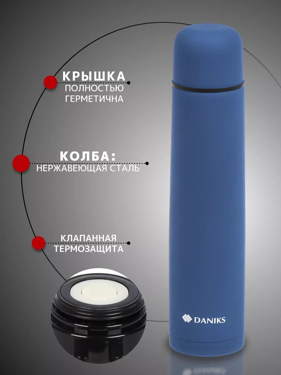 Термос Daniks 1.2 л сапфирово-синий — сохраняет напитки горячими или холодными до 24 часов, не проливается, подходит для путешествий и работы.