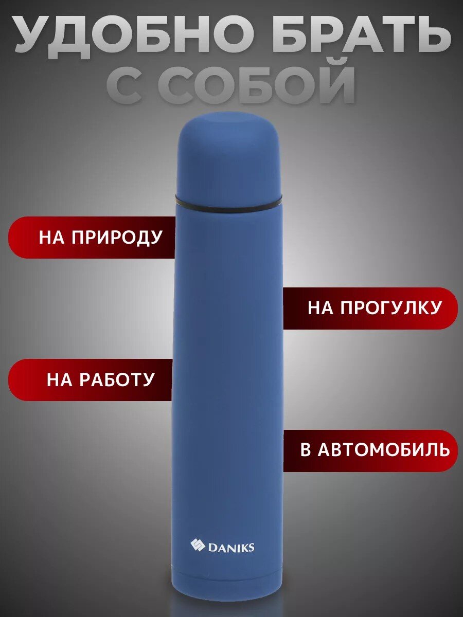Для поездок и ежедневного использования оптимален термос с объемом 1.2 л, как Daniks SL-120ZN-RAL5003-soft: он легкий, компактный и сохраняет температуру до 24 часов.