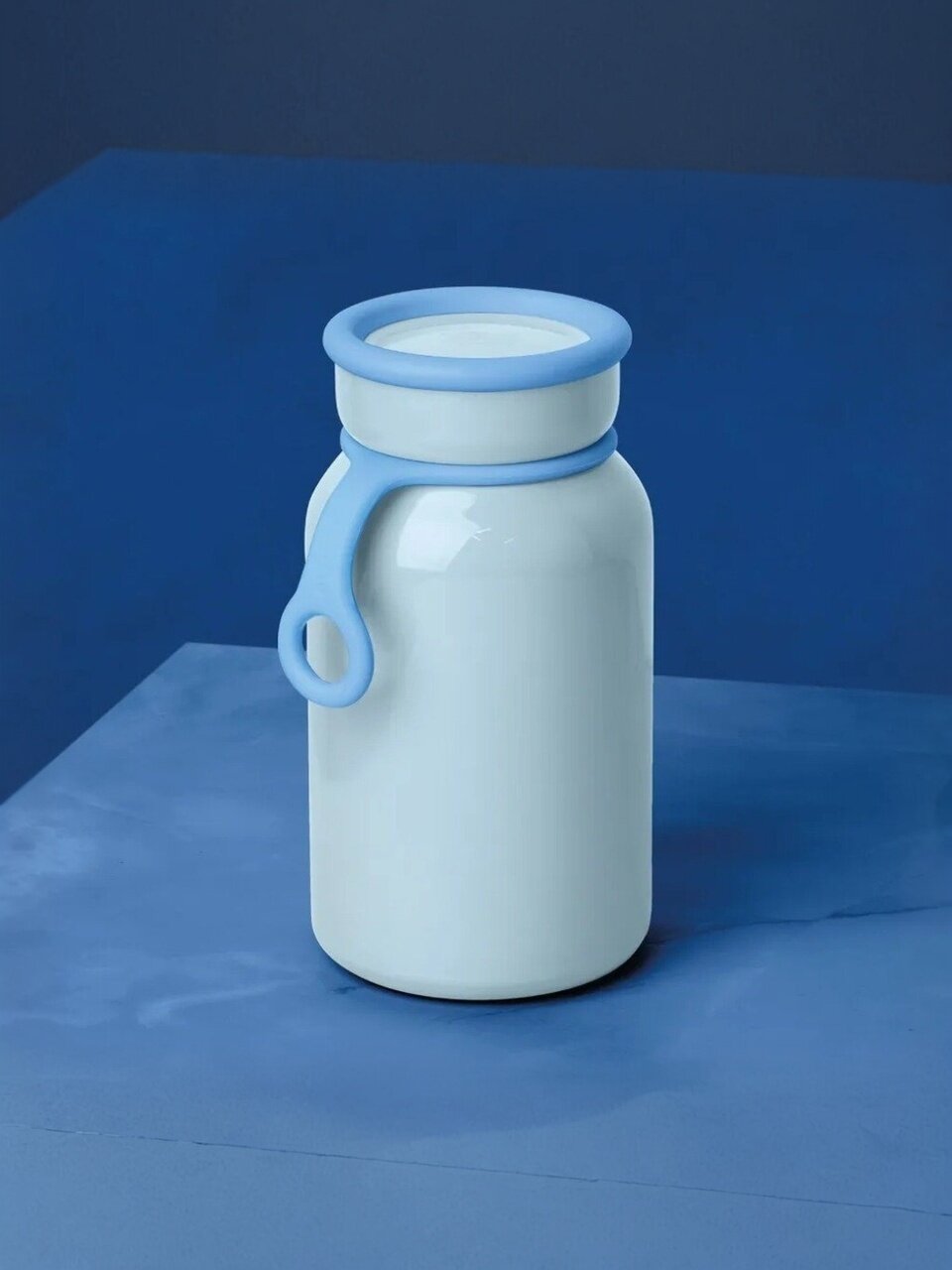 Корпус и колба выполнены из прочной нержавеющей стали с силиконовой вставкой для защиты от ударов и комфортного хвата. Цвет — голубой, без рисунка.