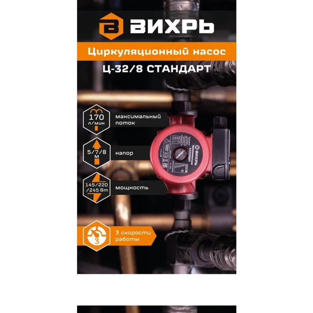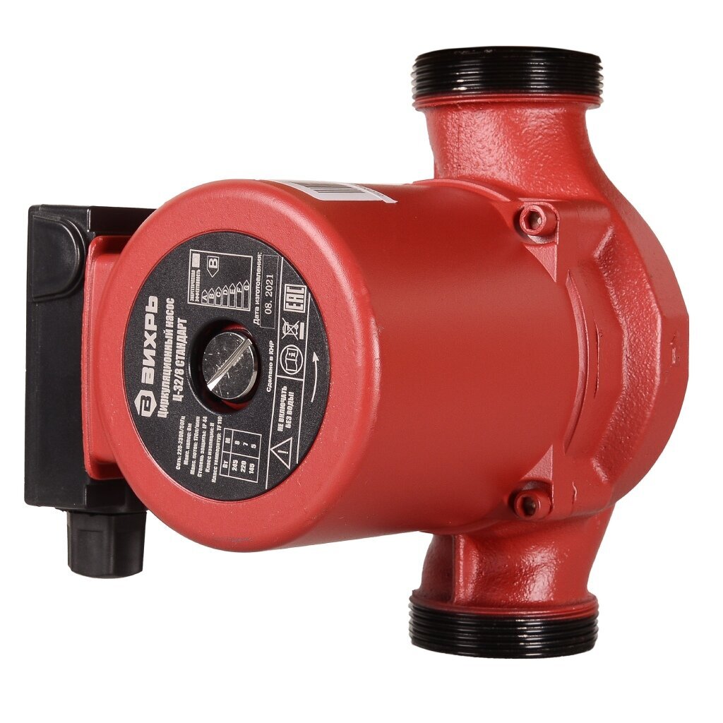 Циркуляционный насос Вихрь Стандарт Ц-32/8 предназначен для обеспечения циркуляции воды в системах отопления, круговых трубопроводах горячего и холодного водоснабжения, центральных отопительных установках и системах перекачки промышленных вод, системах кондиционирования, охлаждения. Насос представляет собой компактное устройство с всасывающей и нагнетающей функциями, вода перекачивается при помощи вращения рабочего колеса электродвигателем насоса. Насос имеет три скорости работы, выбираемые ручным переключением вращающейся ручки на клеммной коробке.
