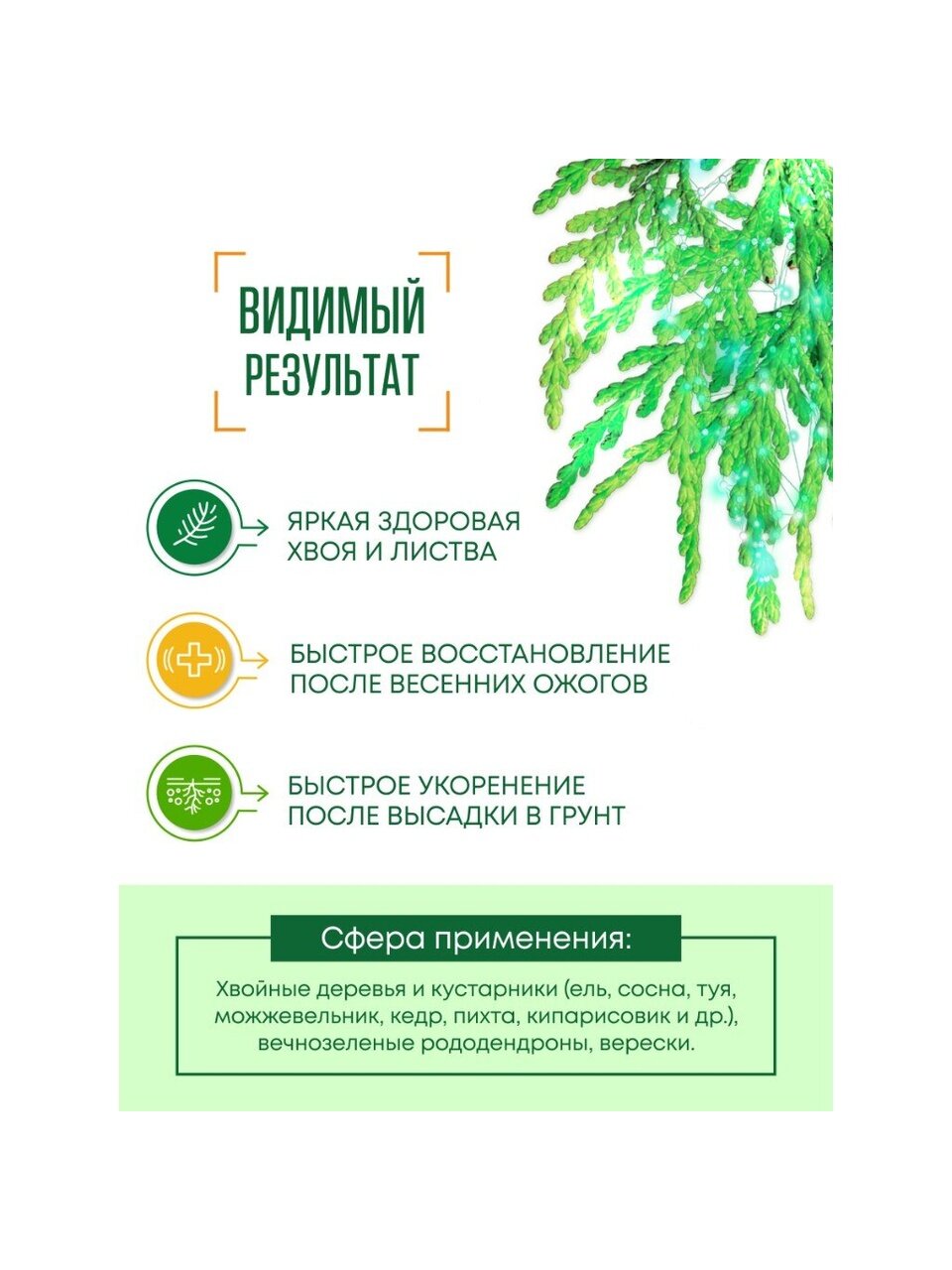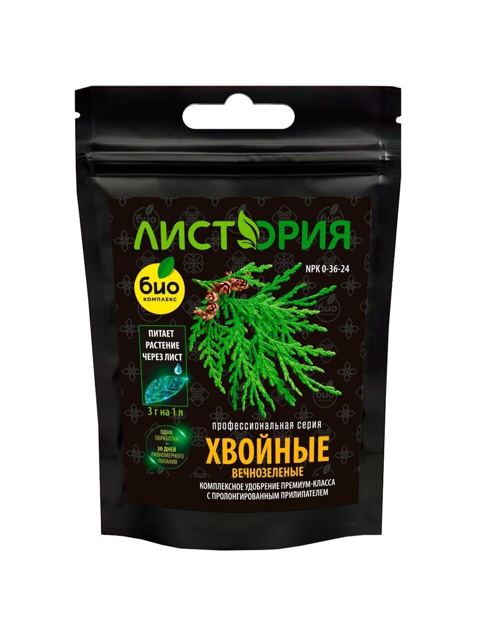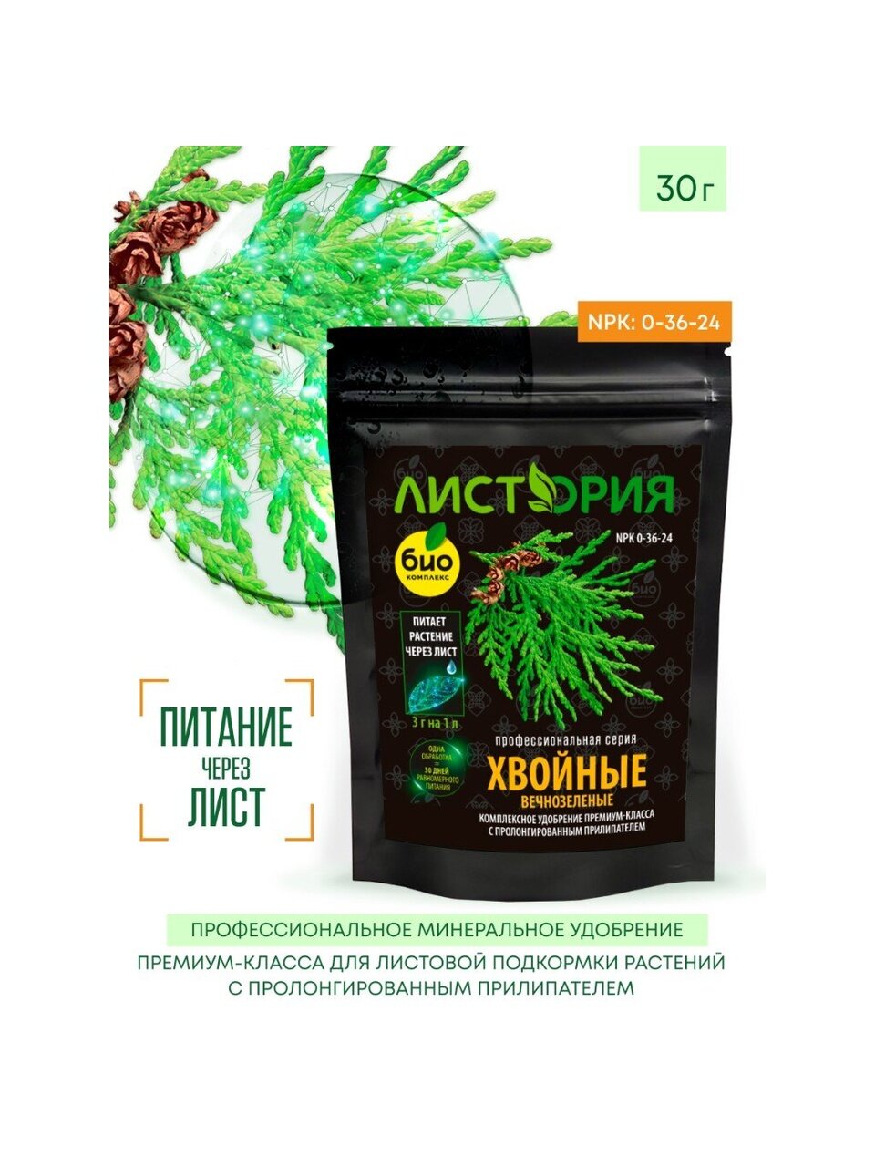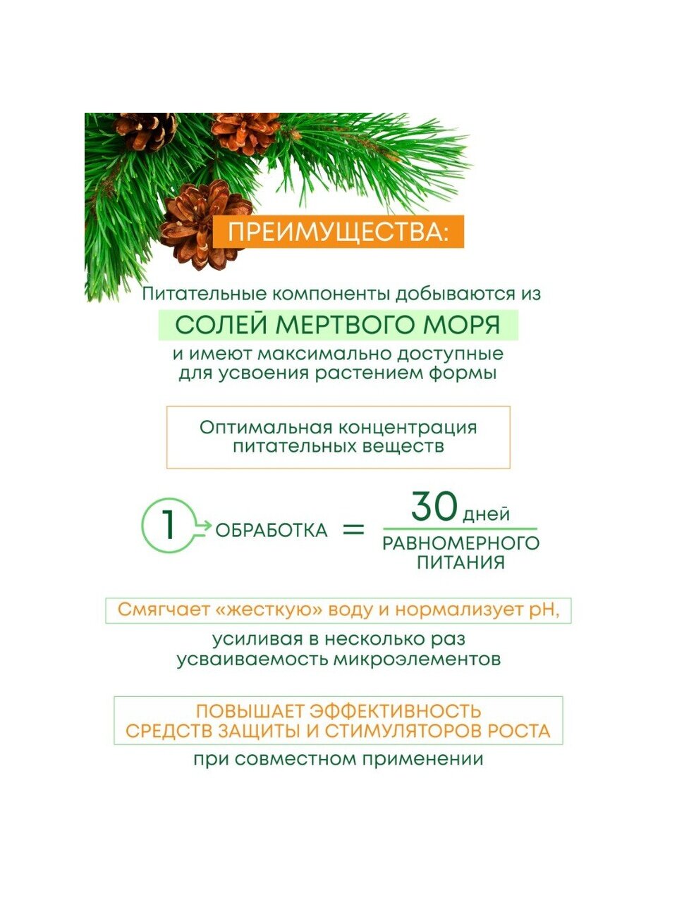 Профессиональное минеральное удобрение премиум-класса с пролонгированным прилипателем для листовой подкормки хвойных культур в течение всего сезона. Питательные компоненты добываются из солей мертвого моря и имеют максимально доступные для усвоения растением формы. Состав смягчает «жесткую» воду и нормализует pH, усиливая в несколько раз усвояемость микроэлементов. Одной обработки хватает на 30 дней равномерного питания.
