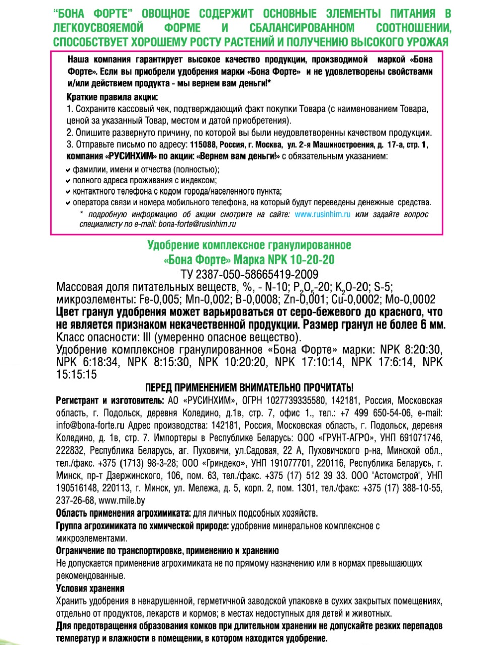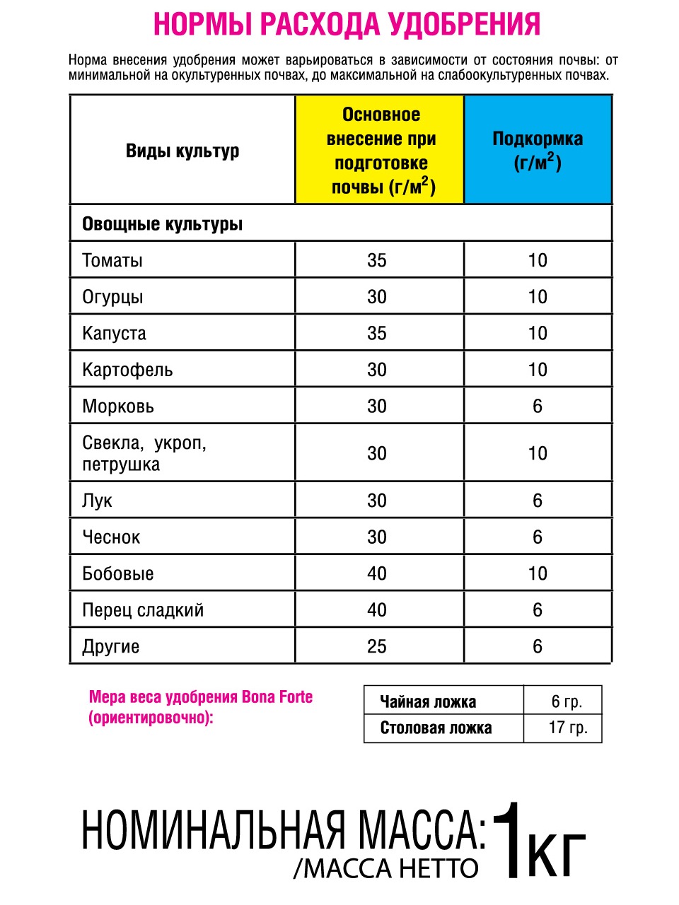 Удобрение Bona Forte Овощное производится в России, вес упаковки — 1000 г. Рекомендуется использовать в течение 3 лет с даты изготовления, указанной на упаковке.
