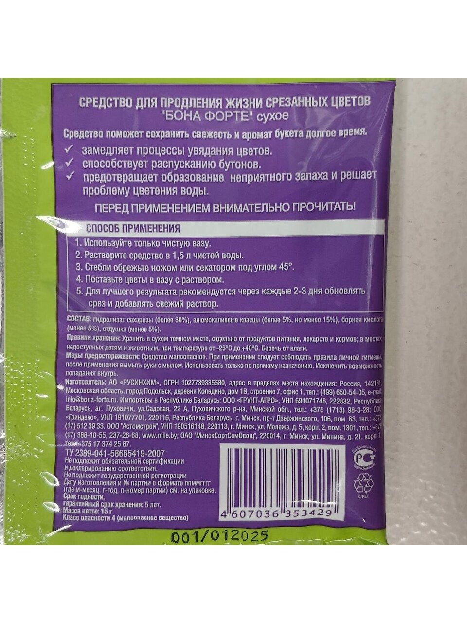 Средство содержит полный комплекс веществ, помогающих сохранить аромат и свежесть букета на долгое время, предотвращающих образование неприятного запаха, способствующих распусканию бутонов.