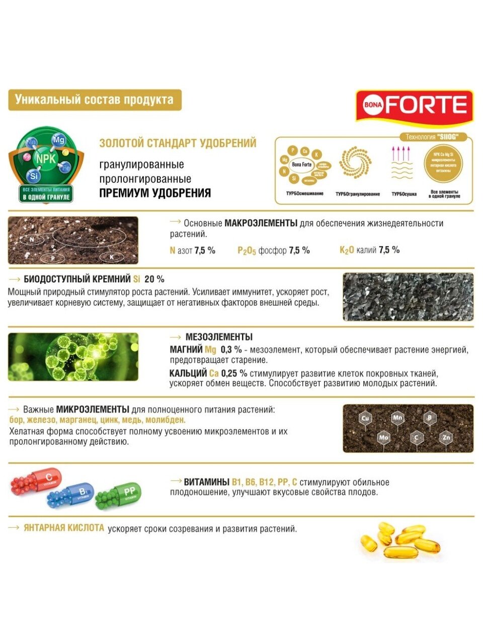 азот (N) - 7.5%, фосфор (P2O5) - 7.5%, калий (K2O) - 7.5%, биодоступный кремний - 20%, магний - 0.3%, кальций - 0.25%, бор, железо, марганец, цинк, медь, молибден, кобальт, янтарная кислота, витамины B1, PP, С. Микроэлементы находятся в хелатной (легкоусваиваемой) форме.