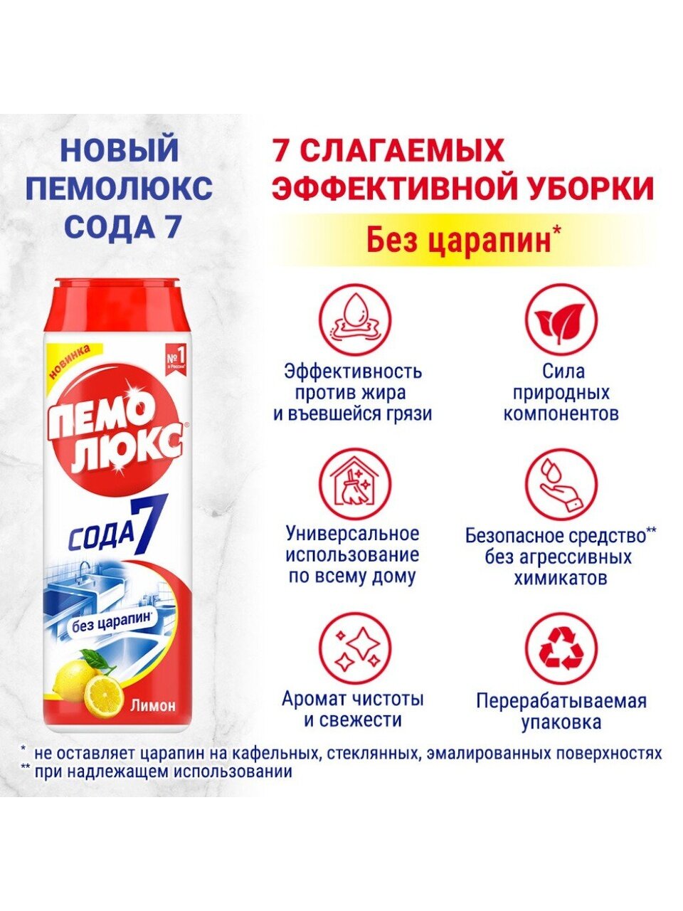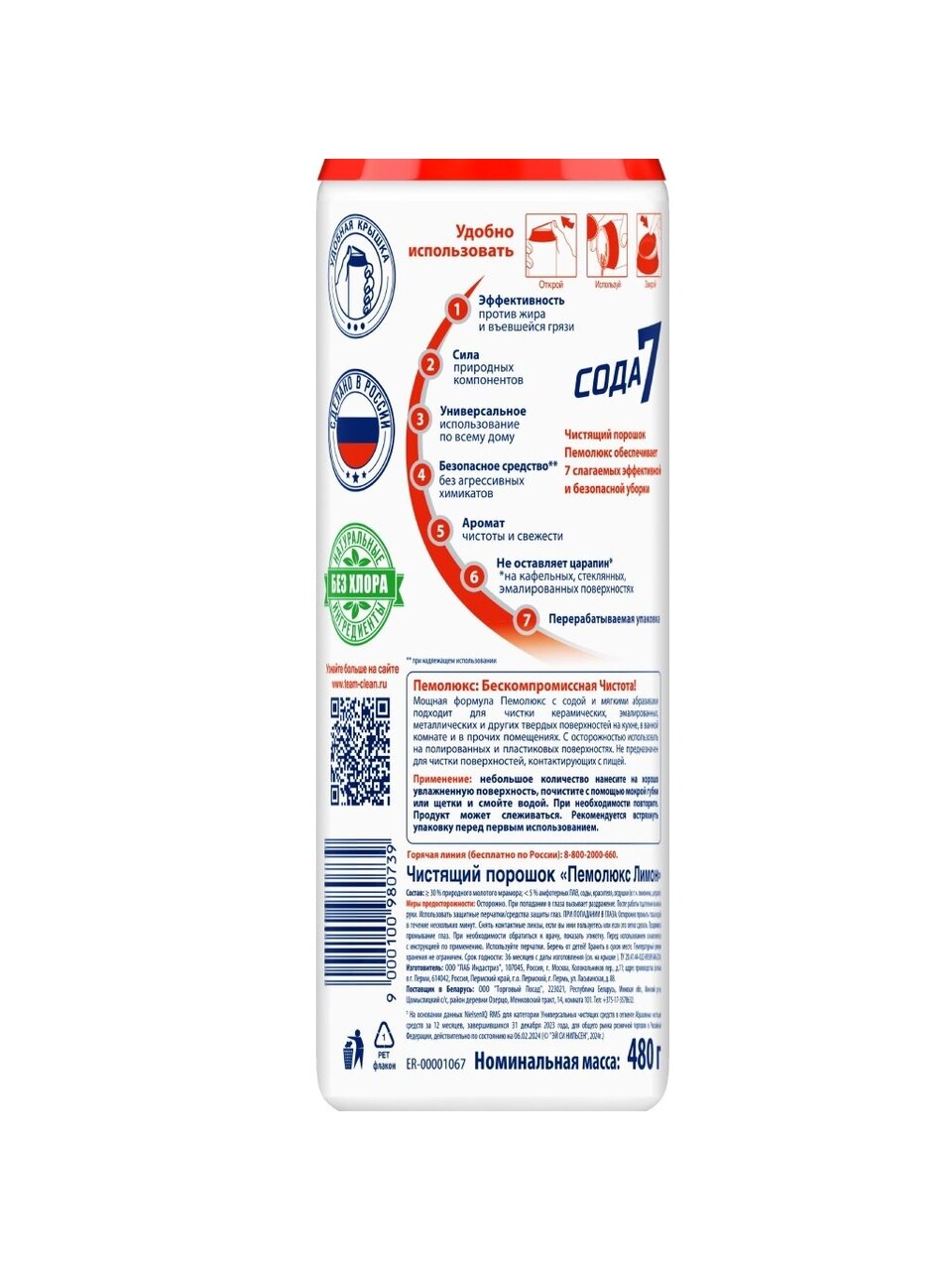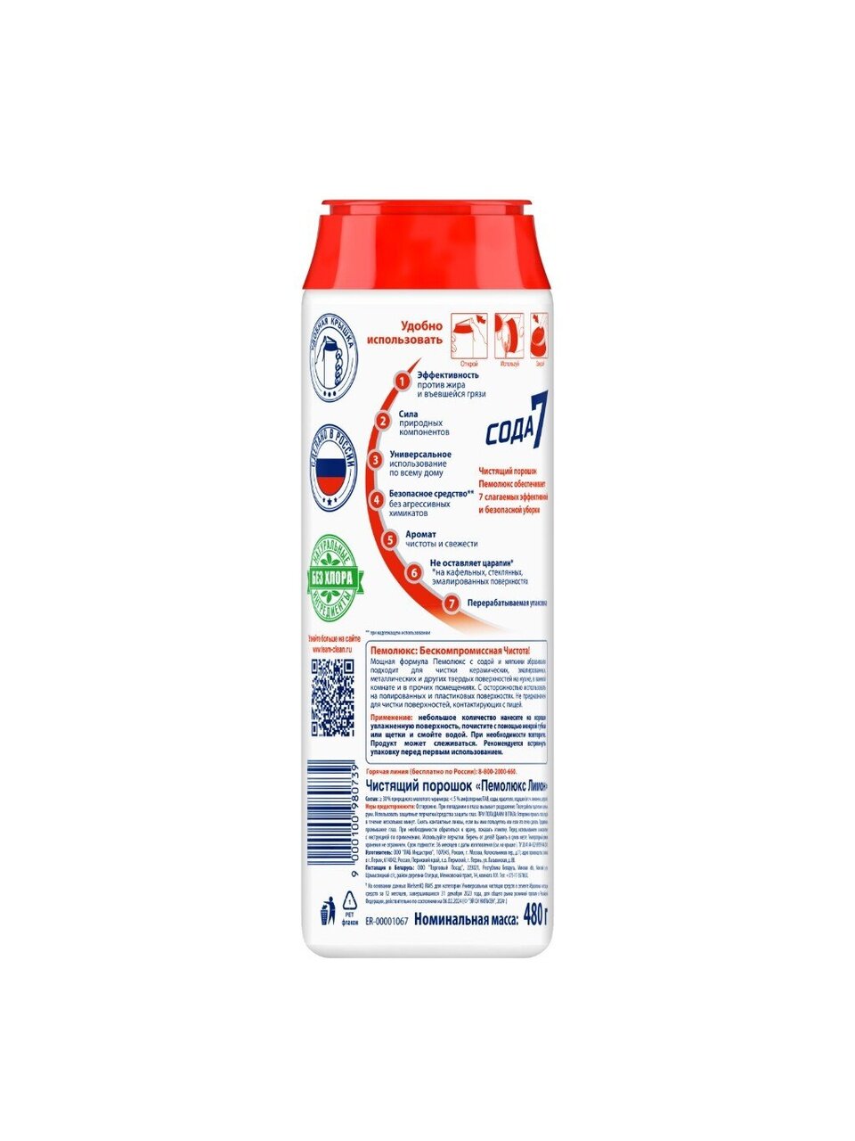 Мощная формула Пемолюкс с содой и мягким абразивом подходит для чистки керамических, эмалированных, металлических и других твердых поверхностей на кухне, в ванной комнате и прочих помещениях. С осторожностью использовать на полированных и пластиковых поверхностях. Не предназначен для чистки поверхностей, контактирующих с пищей.