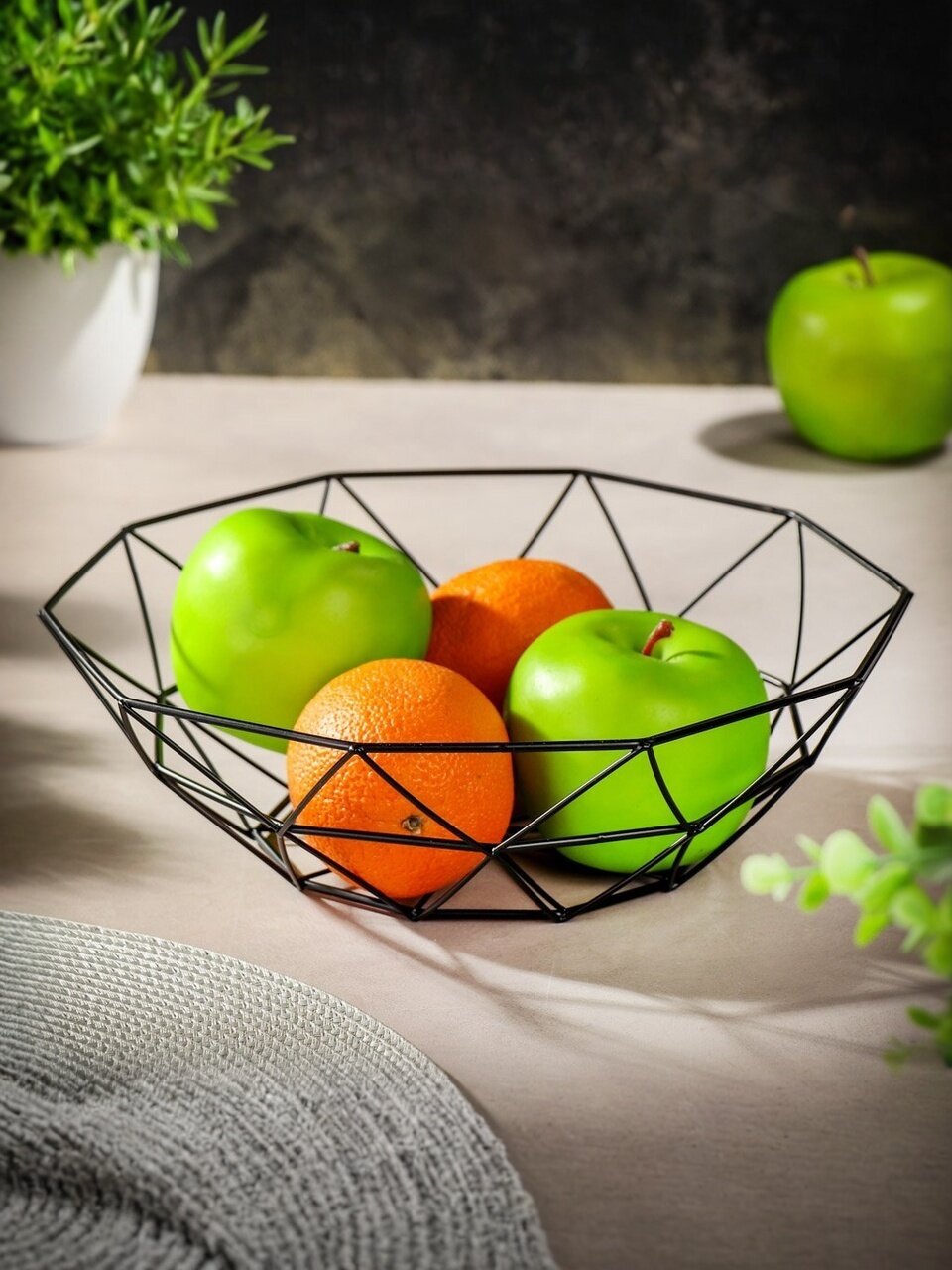 Стильная металлическая корзина для фруктов впишется в любой интерьер Вашего дома и всегда будет радовать Вас и Ваших гостей. Корзина имеет оригинальный геометрический дизайн.