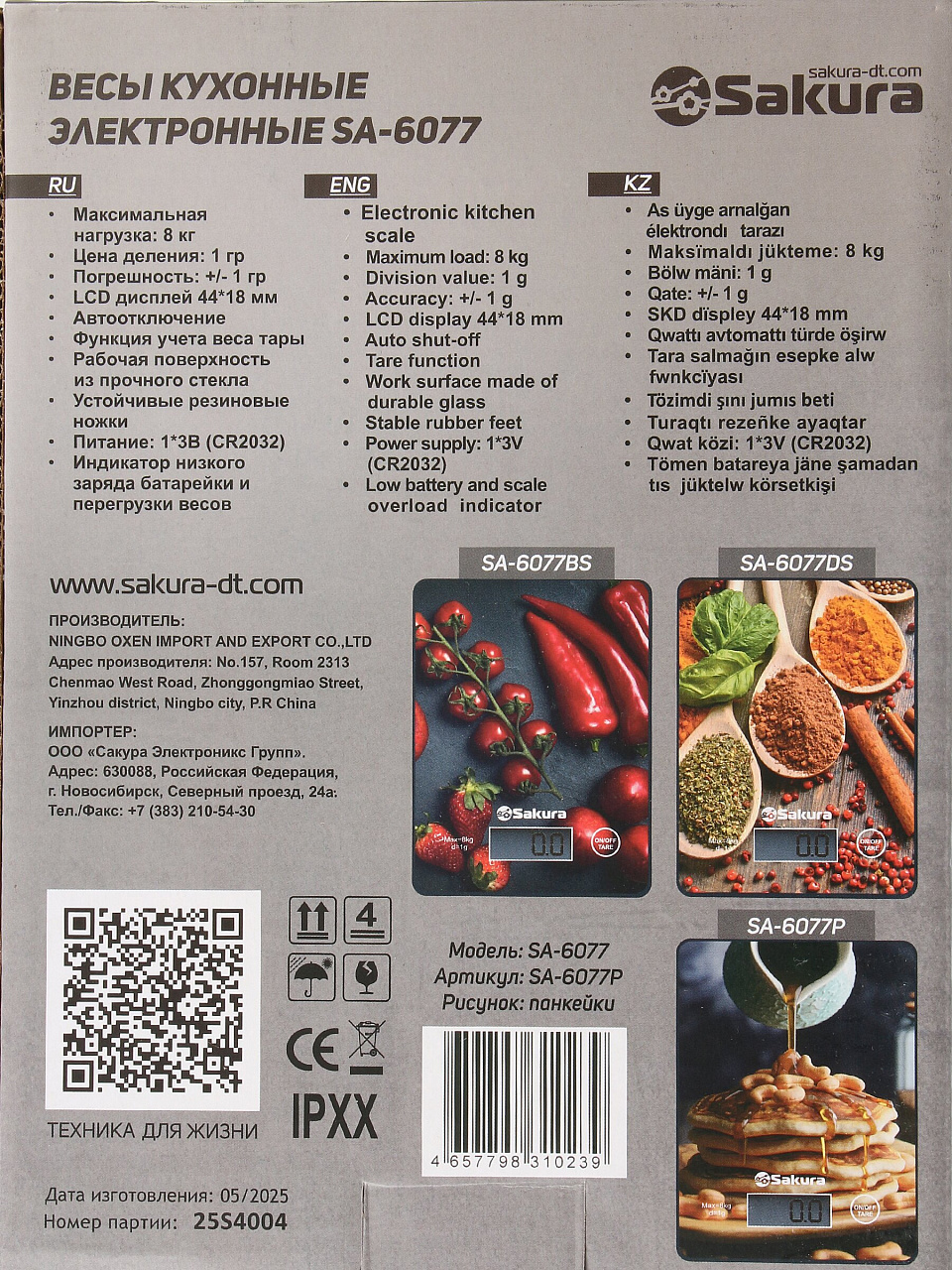 Вы можете приобрести «Весы кухонные электронные, стекло, Sakura, платформа, точность 1 г, до 8 кг, панкейки, SA-6077P» и другие товары в нашем интернет-магазине в Краснодаре по низким ценам и с бесплатным самовывозом.