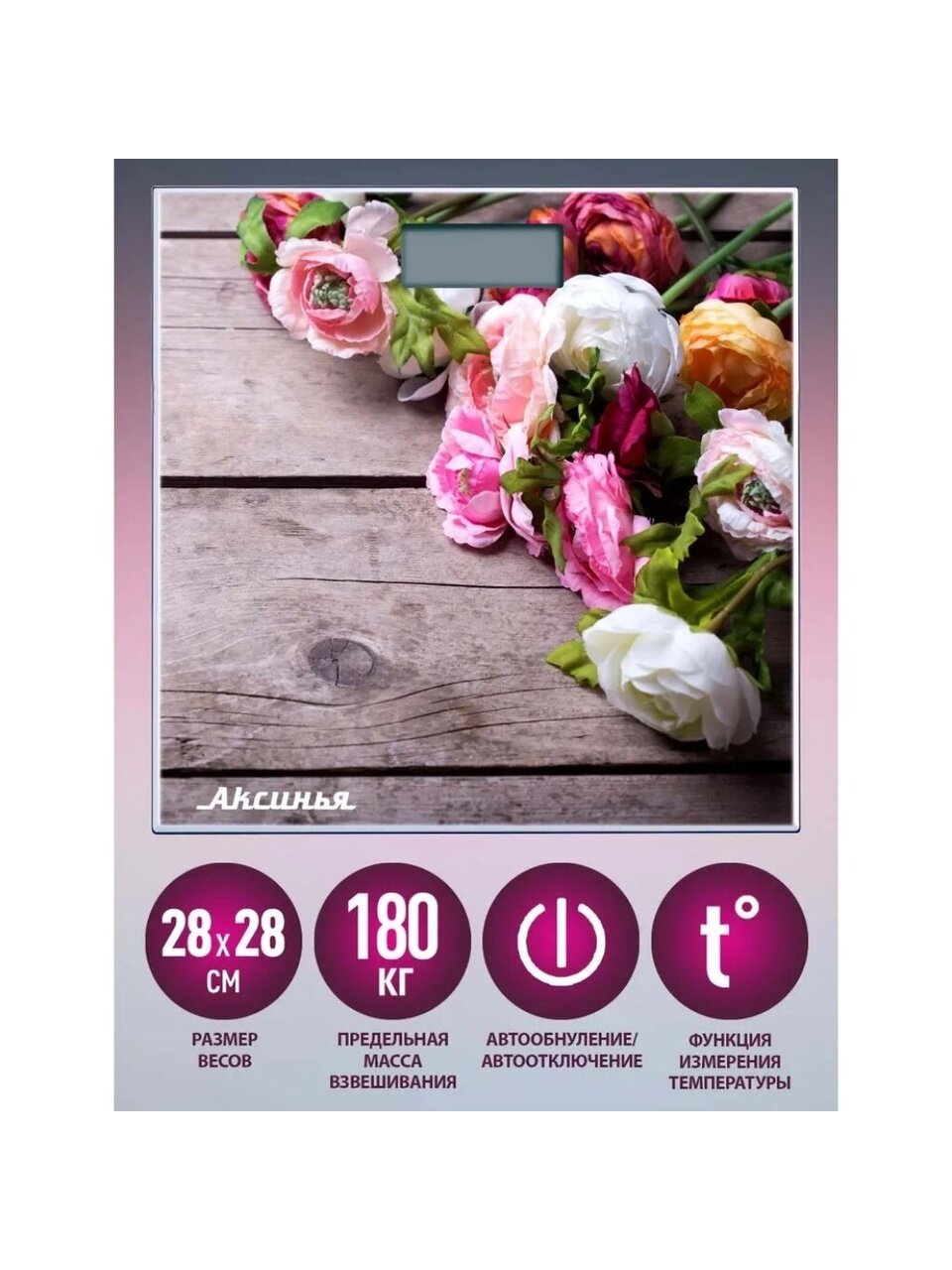 Вы можете приобрести «Весы напольные электронные, Аксинья, КС-6009 Букет, стекло, до 180 кг, 28х28 см, LCD-дисплей» и другие товары в нашем интернет-магазине в Курске по низким ценам и с бесплатным самовывозом.