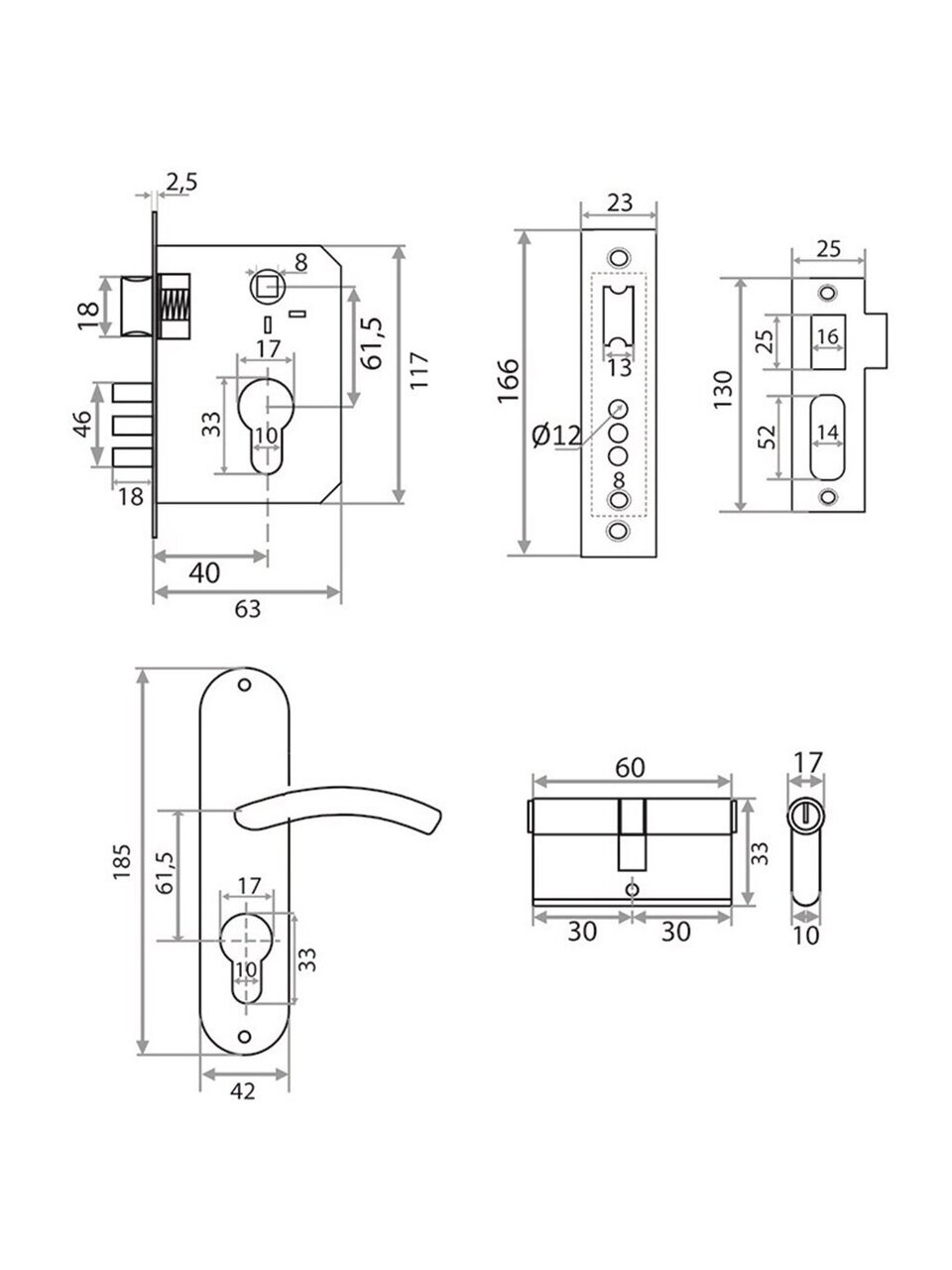 Замок врезной с ручками. Предназначен для установки в деревянные двери толщиной до 40 мм, правого и левого открывания. Межосевое расстояние - 61,5 мм. Удаление ключевого отверстия - 40 мм. Материал ручек - алюминий. Гальваническое покрытие. Комплектация: цилиндровый механизм 60 мм, 5 ключей, ответная планка, винтовые стяжки.