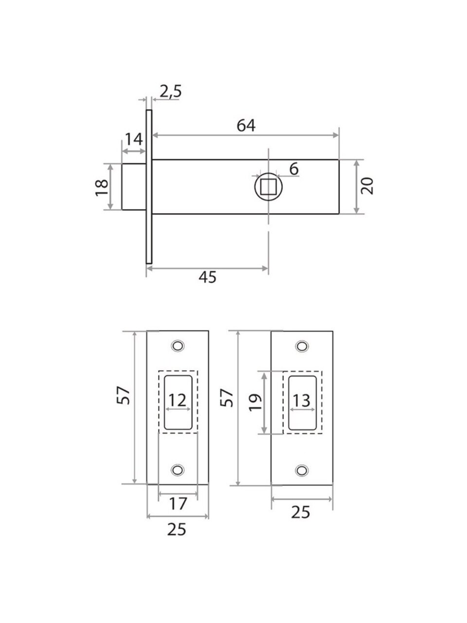 Защелка врезная для установки на деревянные межкомнатные двери. Механизм оснащен металлическим ригелем, что обеспечивает максимальный срок службы. Удаление квадрата под фиксатор - 45 мм. В комплект входит ответная планка и шурупы.