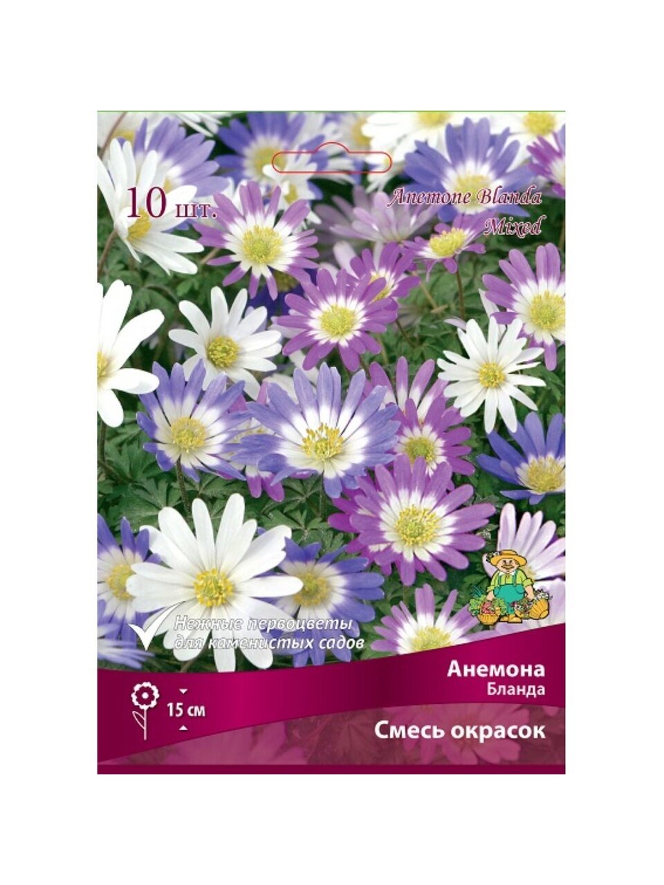 В упаковке — смесь разноцветных луковиц. Вид — анемона, страна продавца — Нидерланды, культура — цветы, условия выращивания — полутень, время посадки — осень.