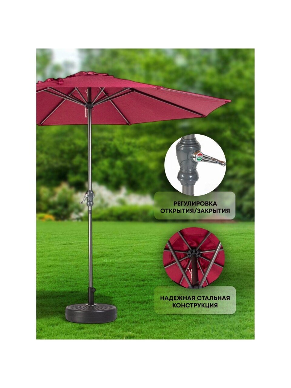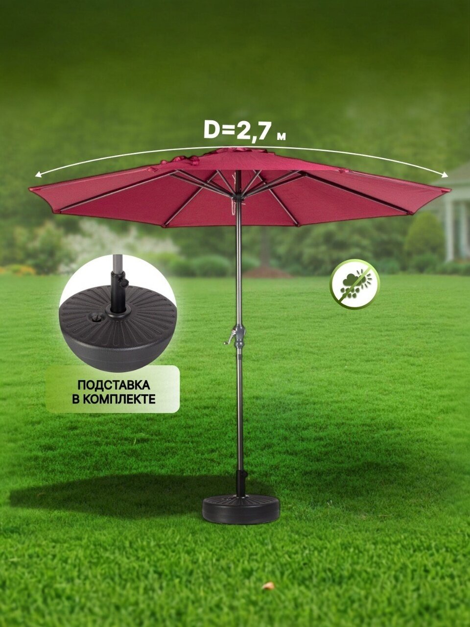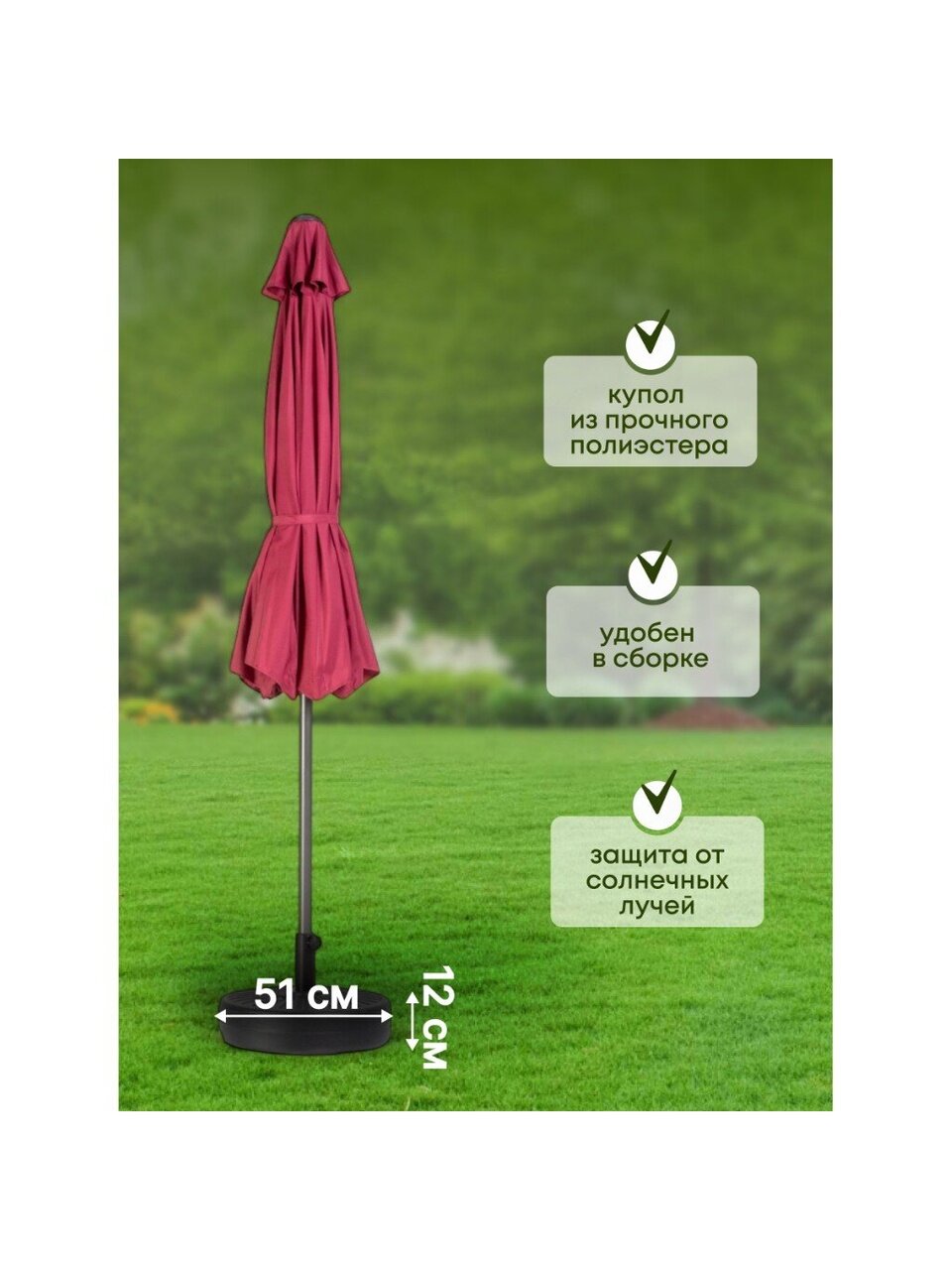 Садовый зонт 2.7х2.7 м бордо с подставкой 51х12х51 см C080018 — стильное и практичное решение для создания уютной зоны отдыха на даче, в саду или на террасе. Эффектный цвет бордо органично впишется в любой ландшафтный дизайн, добавив яркий акцент и подчеркнув индивидуальность пространства. Благодаря продуманной конструкции и прочным материалам зонт обеспечивает надежную защиту от солнца и создает комфортную тень в жаркие летние дни, позволяя наслаждаться свежим воздухом без лишних забот.